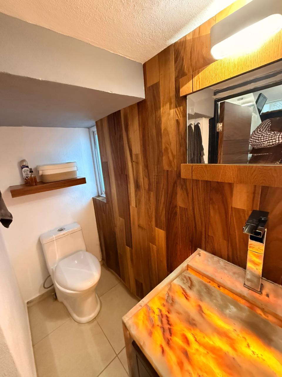 Medio baño con elegantes acabados en ónix.