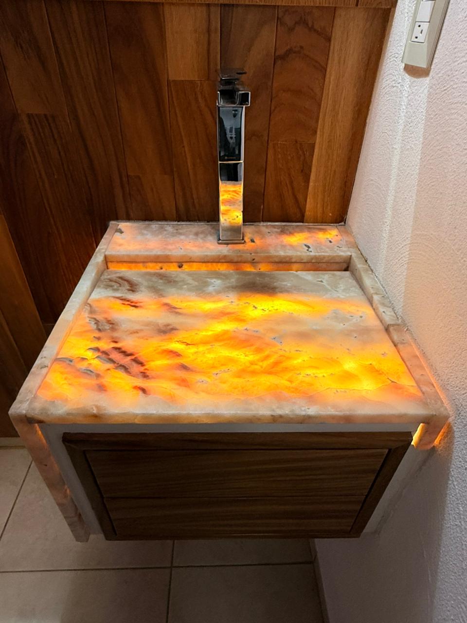 Half bathroom with elegant onyx finishes.