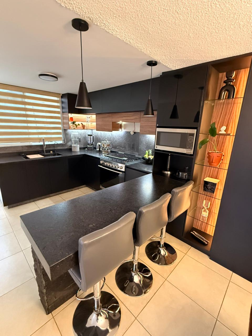 Comedor integrado a una cocina integral recién remodelada, equipada con cubierta de granito, barra desayunadora e iluminación indirecta que realza cada espacio.