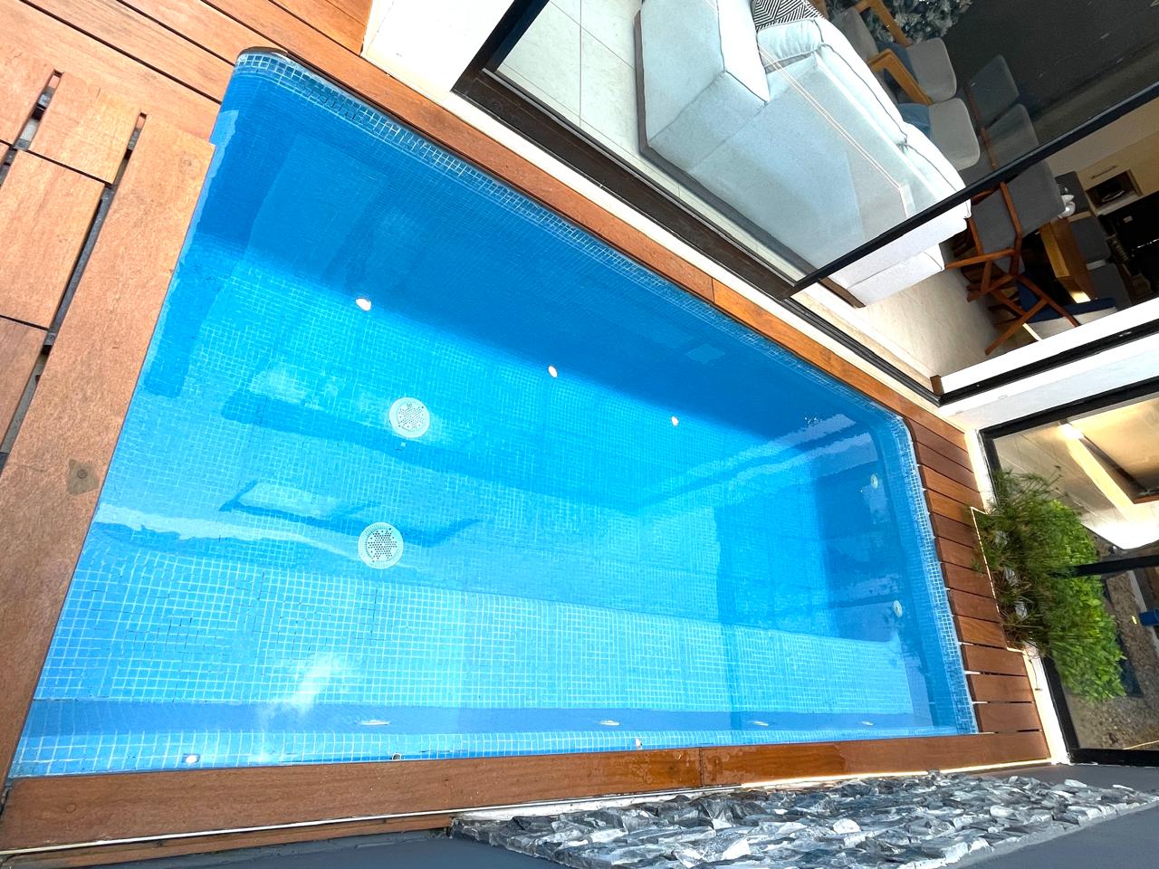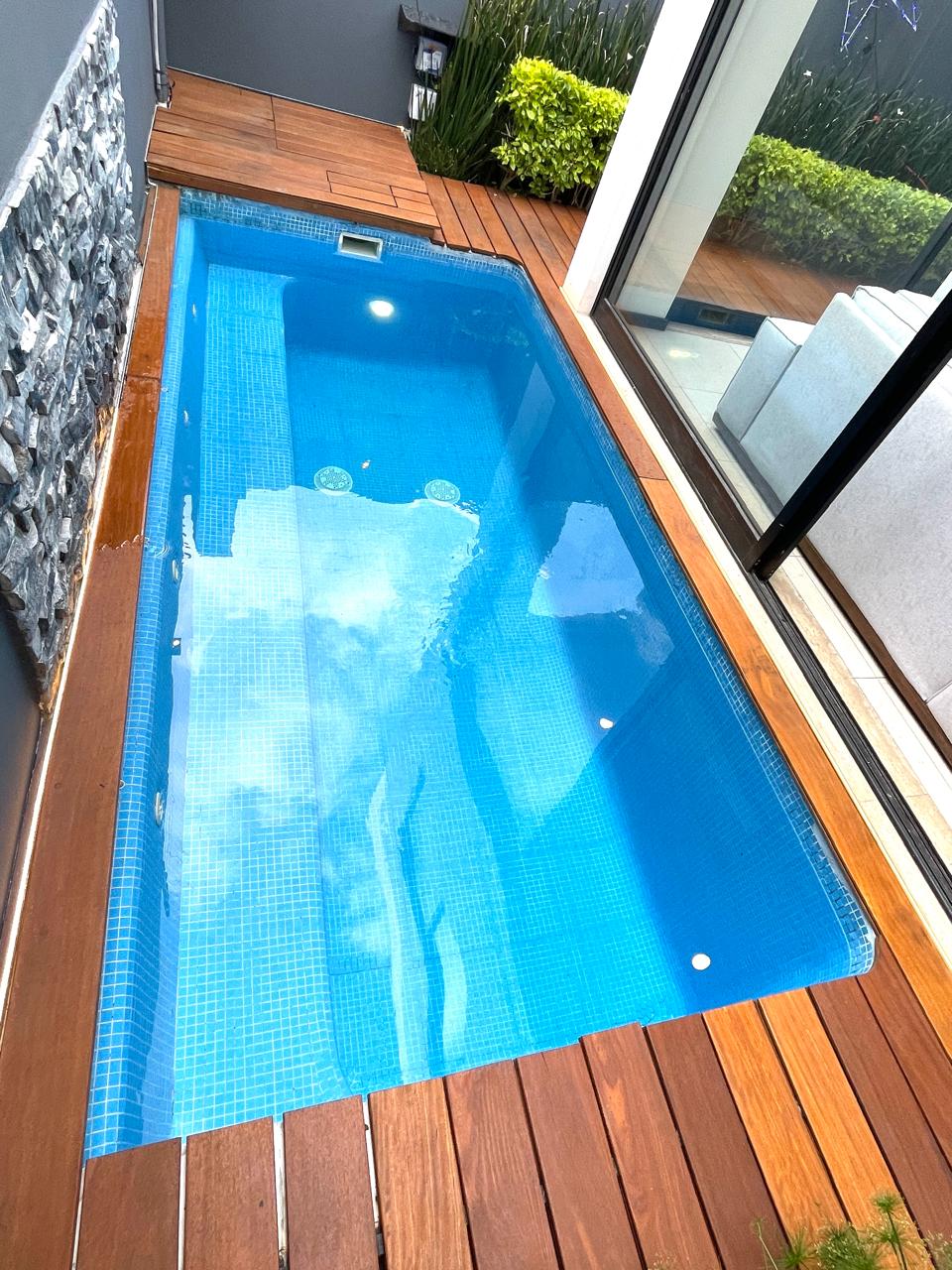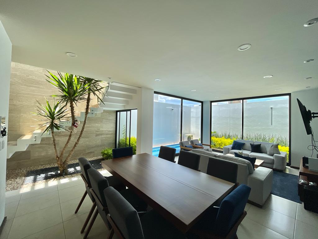 Oasis Social: Planta baja integrada con sala con vista a la alberca, comedor elegante y una terraza con deck de madera natural frente a la alberca climatizada.